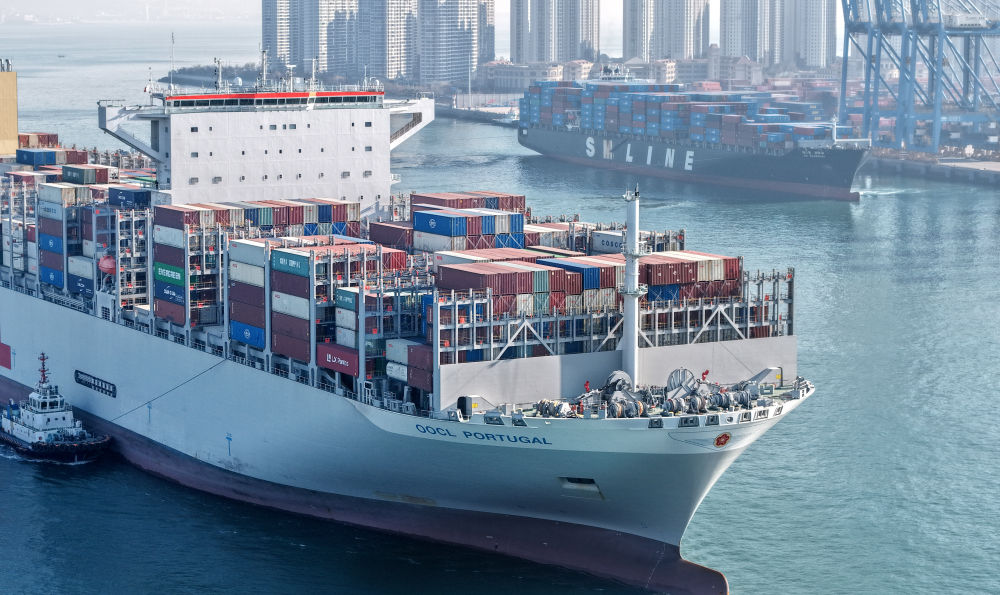 本年2月,货轮进出山东口岸青岛港前湾港区(无人机照片)。